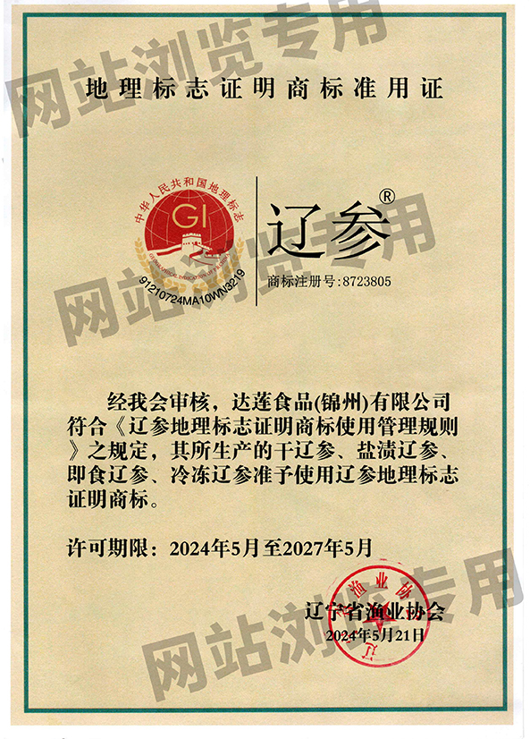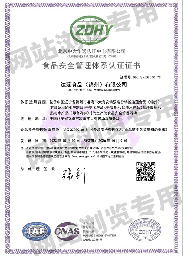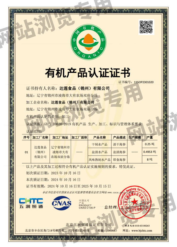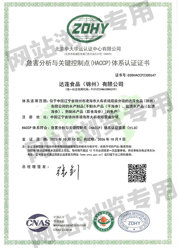 達(dá)蓮公司的遼參產(chǎn)品通過(guò)養(yǎng)殖、加工雙有機(jī)產(chǎn)品認(rèn)證、遼參認(rèn)證、ISO9001質(zhì)量管理體系要求認(rèn)證ISO22000食品安全管理體系、食品鏈中各類組織的要求認(rèn)證、HACCP危險(xiǎn)分析與關(guān)鍵控制點(diǎn)認(rèn)證等。